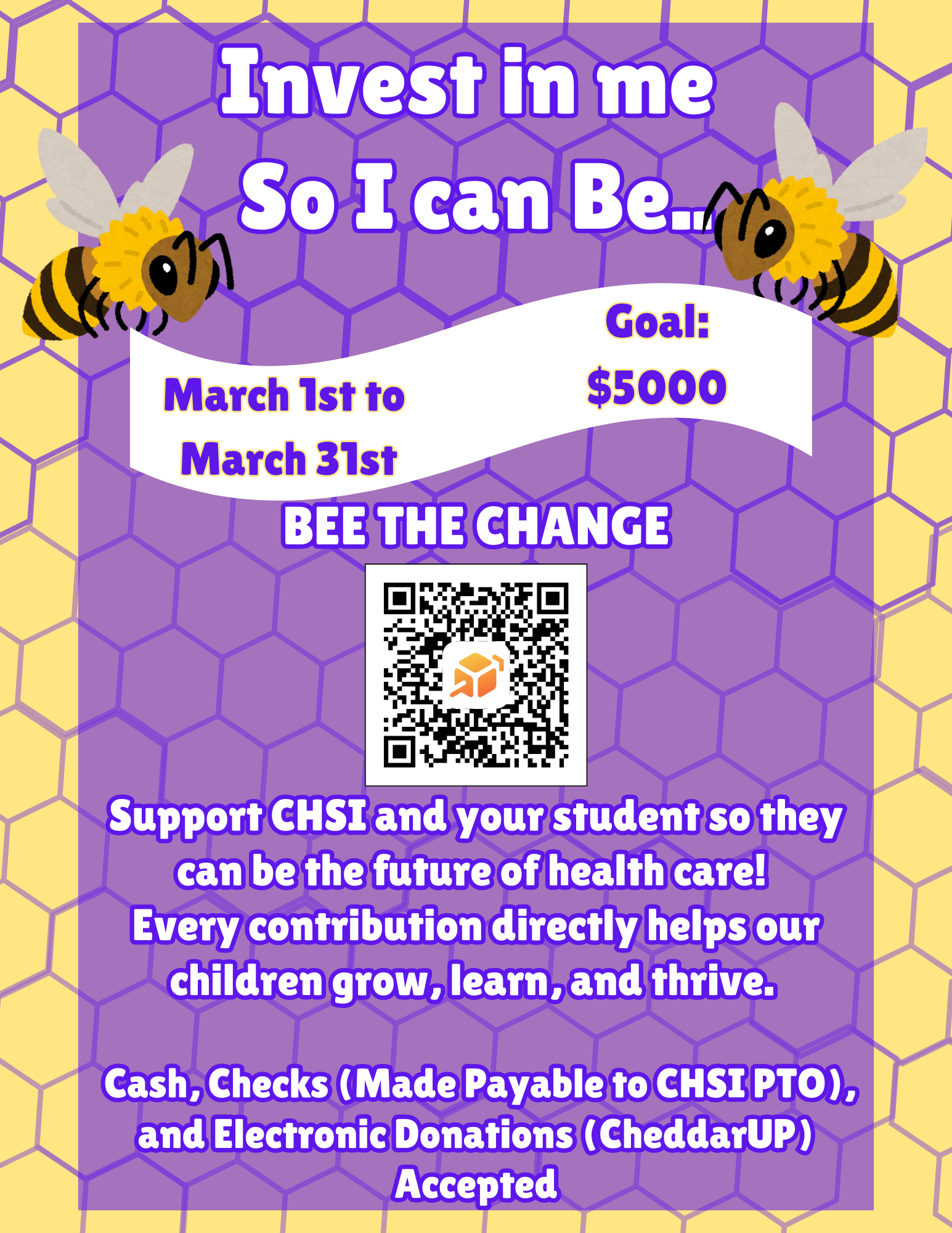 Invest in Your Child- CHSI PTOMarch 1st-31st - BEE the Change. Click here to donate to the PTO campaign. Checks (made payable to CHSI PTO and cash also accepted. Our goal is $5000!